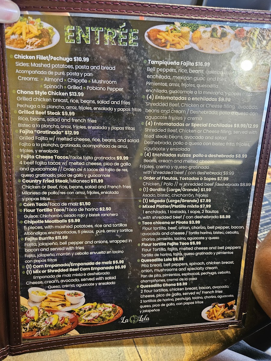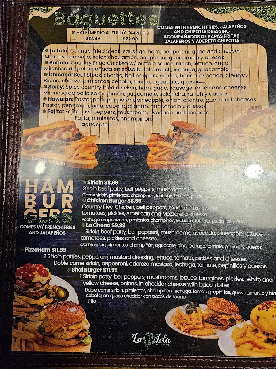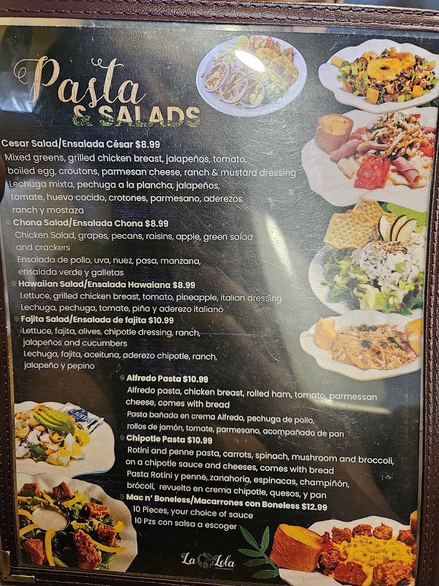 Dining at La Lola Restaurante in Brownsville offers a menu that balances classic comfort with vibrant flavors. Starters and lighter options include pastas like the Chipotle Pasta and Alfredo Pasta, as well as fresh salads such as the Tropical Salad, Buffalo Salad, and Hawaiian Salad. Sandwich lovers can enjoy the Chipotle Club, Sándwich Ligero / Light Sandwich, Sándwich De Club Tradicional / Traditional Club Sandwich, La Lola Club, and the hearty Fajita Sandwich, while baguette selections like La Lola, Búfalo / Buffalo, Picante / Spicy Chicano, and Hawaiano / Hawaiian offer a more artisanal twist. Main courses are equally enticing, with entrees like Quesadilla Lola, Grilled Fajita Chona Style, Enchiladas Suizas w/ Chicken, Grilled Fajita, and Country Fried Chicken / Milanesa de Pollo showcasing the restaurant’s Tex-Mex and American fusion. Burger enthusiasts will find satisfying options in the Fajita, Alambres / Steak With Peppers, Pizzaham, Hamburguesa De Pollo / Chicken Burger, and Solomillo / Sirloin. For breakfast and lunch, the menu features classics like Muffin, Waffles, Any Style Eggs, the American Breakfast, and Chicken Chilaquiles, ensuring a hearty start to the day. Overall, the menu reflects a mix of bold flavors, generous portions, and approachable variety, making La Lola Restaurante a versatile spot for any meal occasion.