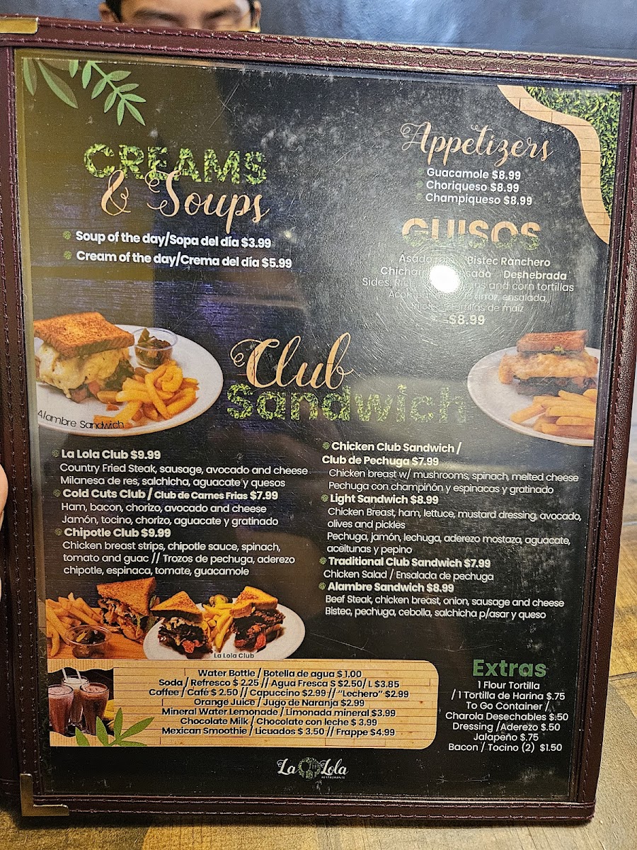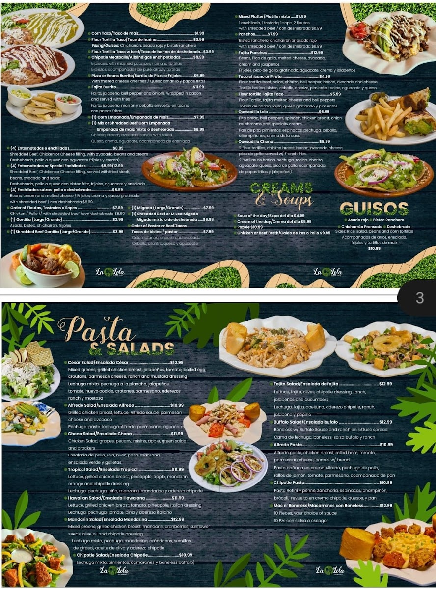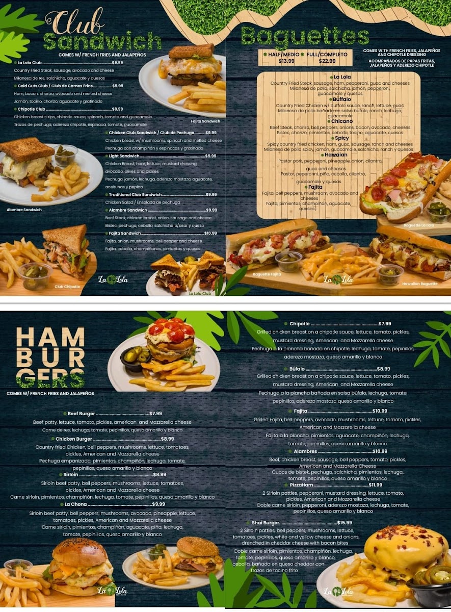 Dining at La Lola Restaurante in Brownsville offers a menu that balances classic comfort with vibrant flavors. Starters and lighter options include pastas like the Chipotle Pasta and Alfredo Pasta, as well as fresh salads such as the Tropical Salad, Buffalo Salad, and Hawaiian Salad. Sandwich lovers can enjoy the Chipotle Club, Sándwich Ligero / Light Sandwich, Sándwich De Club Tradicional / Traditional Club Sandwich, La Lola Club, and the hearty Fajita Sandwich, while baguette selections like La Lola, Búfalo / Buffalo, Picante / Spicy Chicano, and Hawaiano / Hawaiian offer a more artisanal twist. Main courses are equally enticing, with entrees like Quesadilla Lola, Grilled Fajita Chona Style, Enchiladas Suizas w/ Chicken, Grilled Fajita, and Country Fried Chicken / Milanesa de Pollo showcasing the restaurant’s Tex-Mex and American fusion. Burger enthusiasts will find satisfying options in the Fajita, Alambres / Steak With Peppers, Pizzaham, Hamburguesa De Pollo / Chicken Burger, and Solomillo / Sirloin. For breakfast and lunch, the menu features classics like Muffin, Waffles, Any Style Eggs, the American Breakfast, and Chicken Chilaquiles, ensuring a hearty start to the day. Overall, the menu reflects a mix of bold flavors, generous portions, and approachable variety, making La Lola Restaurante a versatile spot for any meal occasion.